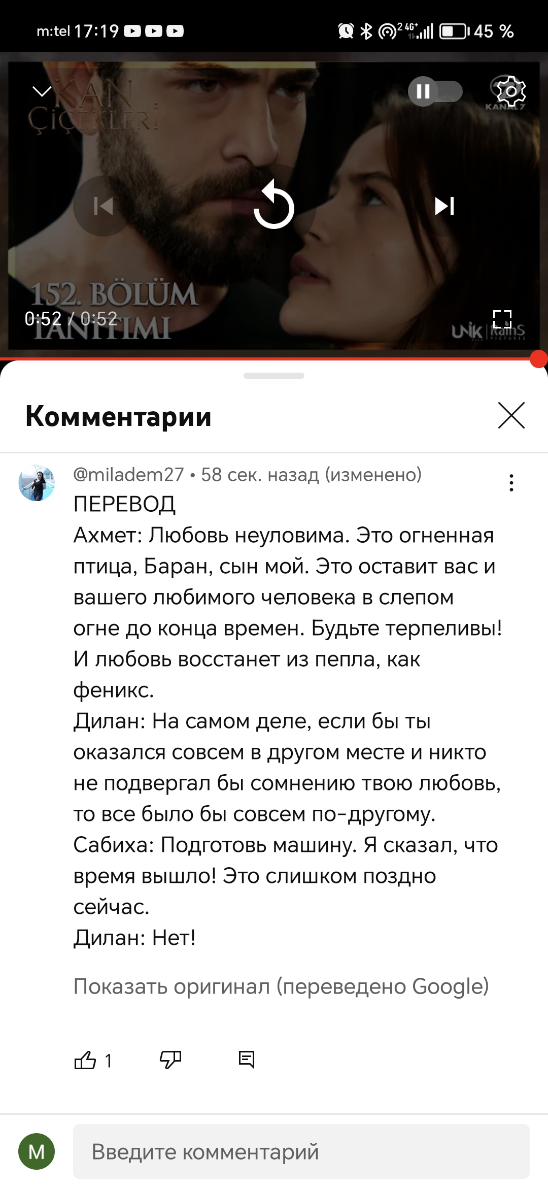 Пересмотрела серию..Мда, тяжёлый случай. Меня тоже удивляет недальновидность Барана. Вот так, как говорится, поверить с первого раза в нелюбовь Дилан, в её желание отомстить, а тем более ненавидеть кого-либо. Взрослый дядька, а поведение мальчишки-подростка. Но меня впечатлила игра Ягмур - так показать свой страх ото сна, глаза безумные, дотрагивается до мужа, чтобы убедиться, что ему не причинили вреда. Ну а Баран даже не понял, что вот она, настоящая и любящая Дилан... Опять будет терроризировать жену, разрываясь между любовью, желанием обнимать, целовать или " сожрать" , не пережёвывая.. Но в чём я соглашусь с Вами, Танечка, так это в том, что Дилан надо закрыть своей грудью Барана, не пожалев жизни и может быть...тогда придет осознание к Баранчику, кто кого любит...
